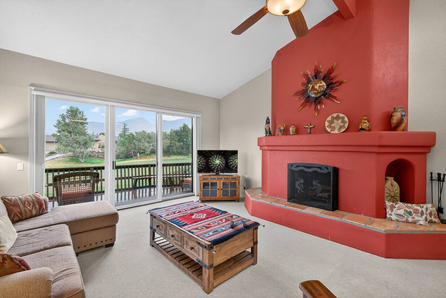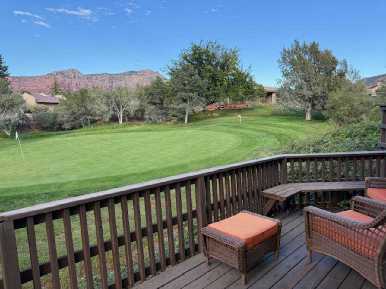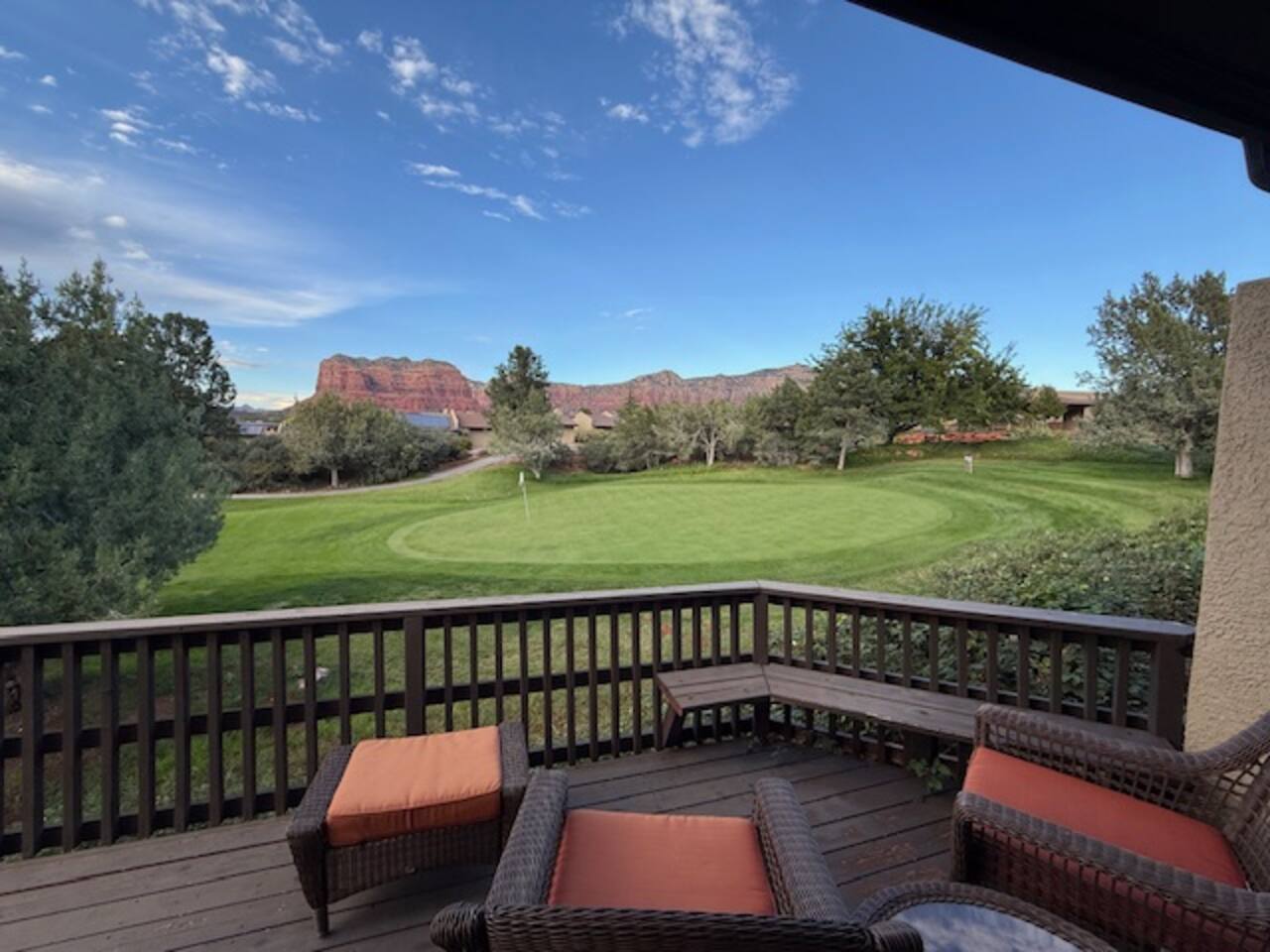 The Space Welcome to your perfect Sedona getaway—where comfort meets stunning natural beauty and views. This cozy 2BR/2BA townhome sits right along the green of Canyon Mesa golf course, offering fantastic views of Sedona’s iconic red rocks. Whether you’re here to relax, explore, or play a few rounds of golf, this home delivers a seamless blend of tranquility and convenience. Inside the Home Step into a bright, open living space designed to feel both cozy and refined. Natural light pours in, highlighting the clean, Aztec finishes and comfortable furnishings. Kick back on the sofa, stream your favorite shows on the TV, or simply unwind after a day outdoors. High-speed Wi-Fi and an in-unit washer/dryer make it easy to settle in—whether you’re staying for a weekend or a while. The kitchen is fully stocked with everything you need to cook and entertain. From morning coffee to evening dinners, enjoy meals inside at the dining table or take things outside to soak in the views. Outdoor Living This home truly shines outdoors. Start your mornings on the private deck overlooking the course, where peaceful surroundings and red rock vistas set the tone for the day. In the evening, unwind in the courtyard or fire up the electric BBQ for a relaxed dinner at sunset. Multiple outdoor spaces give you room to spread out, recharge, and enjoy Sedona’s incredible scenery. Sleeping Arrangements Primary Suite: King bed, en-suite bathroom, streaming TV Guest Bedroom: Queen bed, nearby full bath, streaming TV Den: Couch with fold-out bed Traveling with extra guests or little ones? Pack ’n Play, and highchair are all available for added flexibility. Community Perks Just a short stroll away, you’ll have access to resort-style amenities that elevate your stay: Heated pool (open and heated April 15 – November 15, weather permitting) Open year-round hot tub Tennis & pickleball courts Easy access to Canyon Mesa Golf Course Golf lovers will appreciate being steps from one of the top-rated short courses in the country—perfect for a quick round or a full day on the greens. Good to Know Open parking available throughout the community Prime Sedona Location You’re perfectly positioned to experience the best of Sedona—just minutes from hiking trails, scenic viewpoints, restaurants, and local shops. Whether your trip is all about adventure, relaxation, or a bit of both, this townhome offers a comfortable, stylish home base in an unbeatable setting.
