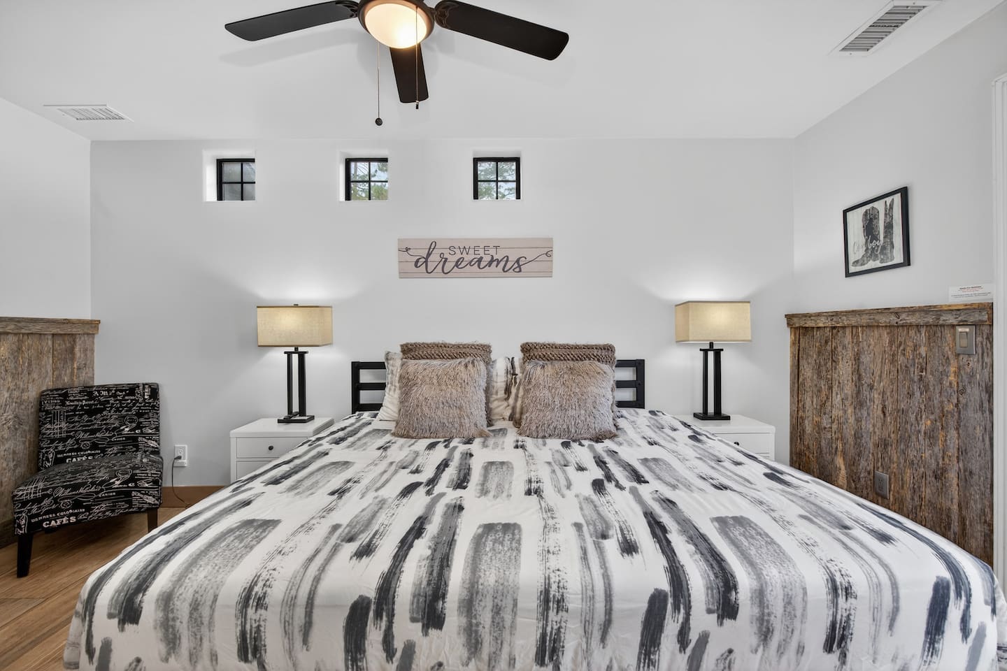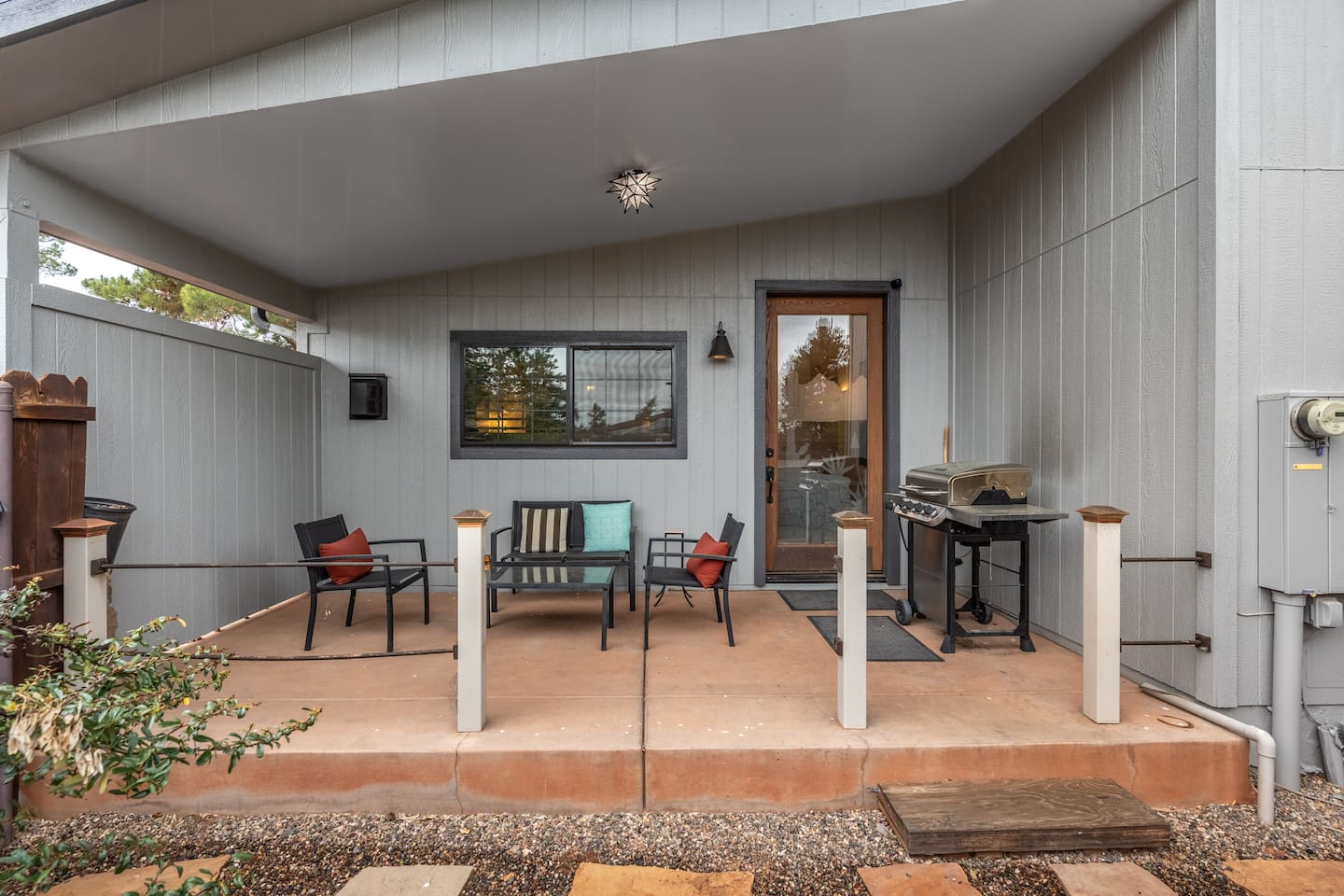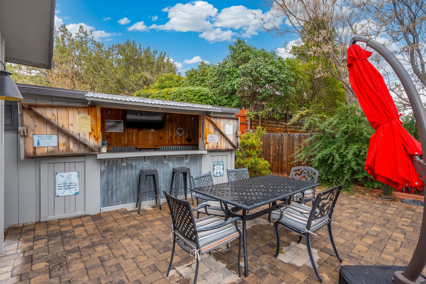 🛏 Sleeping Arrangements (Sleeps 6) • Primary Bedroom: King bed • Bedroom 2: Queen bed • Bedroom 3: Two twin beds ⭐ Modern Cowboy Highlights ✔ Private hot tub under the stars ✔ Outdoor saloon + fire pit hangout ✔ Fully fenced yard (pet-friendly) ✔ Covered patio with dining & lounge seating ✔ Gas fireplace for cozy desert nights ✔ 5 Smart TVs + high-speed WiFi ✔ Single-level home with step-free entry ✔ Quiet, safe neighborhood 🍳 Stocked Frontier Kitchen A full modern kitchen ready for camp-style breakfasts or chef-level dinners: Stove, oven, microwave, dishwasher, refrigerator & freezer, crockpot, blender, coffee maker, grinder, toaster, toaster oven, spices, and breakfast bar seating. 🌄 Prime Sedona Location Ride out to Sedona’s most famous destinations just minutes away: • Red Rock State Park • Slide Rock State Park • Devil’s Bridge • Chimney Rock • Downtown Sedona, shopping, dining & scenic drives 🔥 Backyard Western Hideout Your private desert compound includes: • Hot tub • Fire pit • Covered patio • Outdoor dining • Fully fenced yard • Signature outdoor saloon for gathering, games & evening drinks 🚗 Parking • Driveway for 2 vehicles • Free street parking • RV/trailer parking allowed (Garage not accessible to guests)