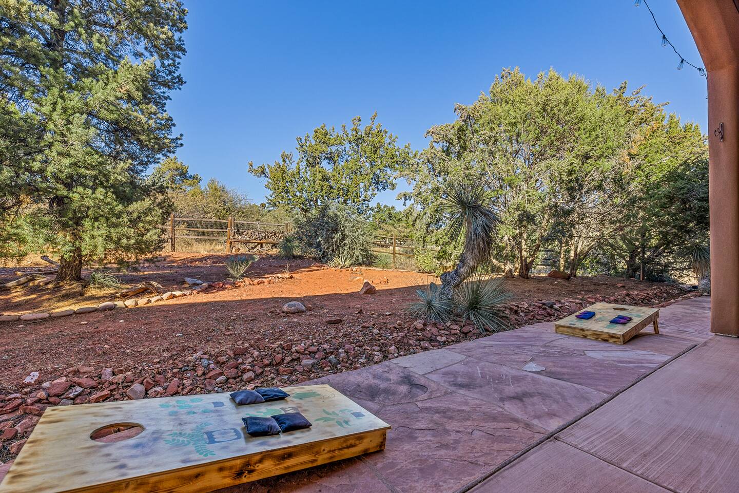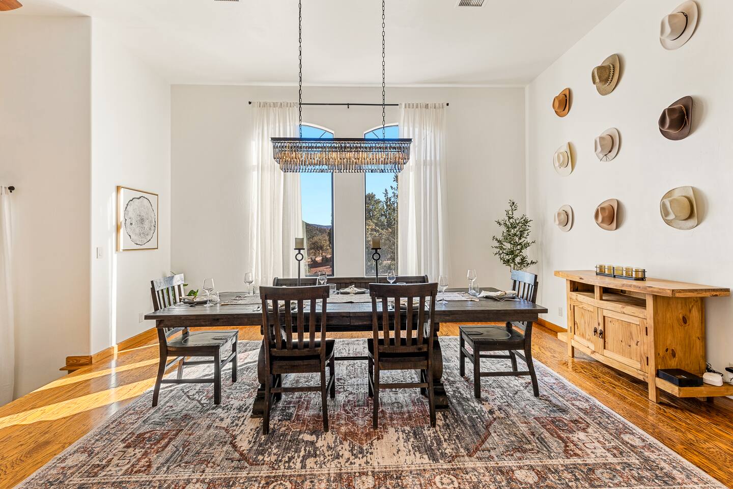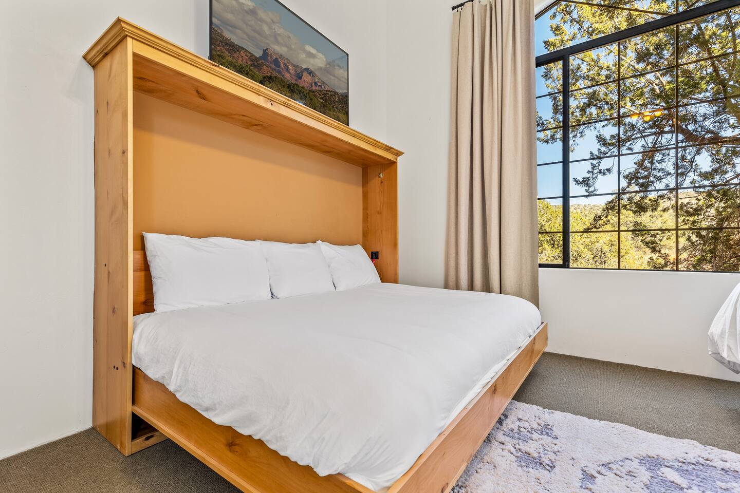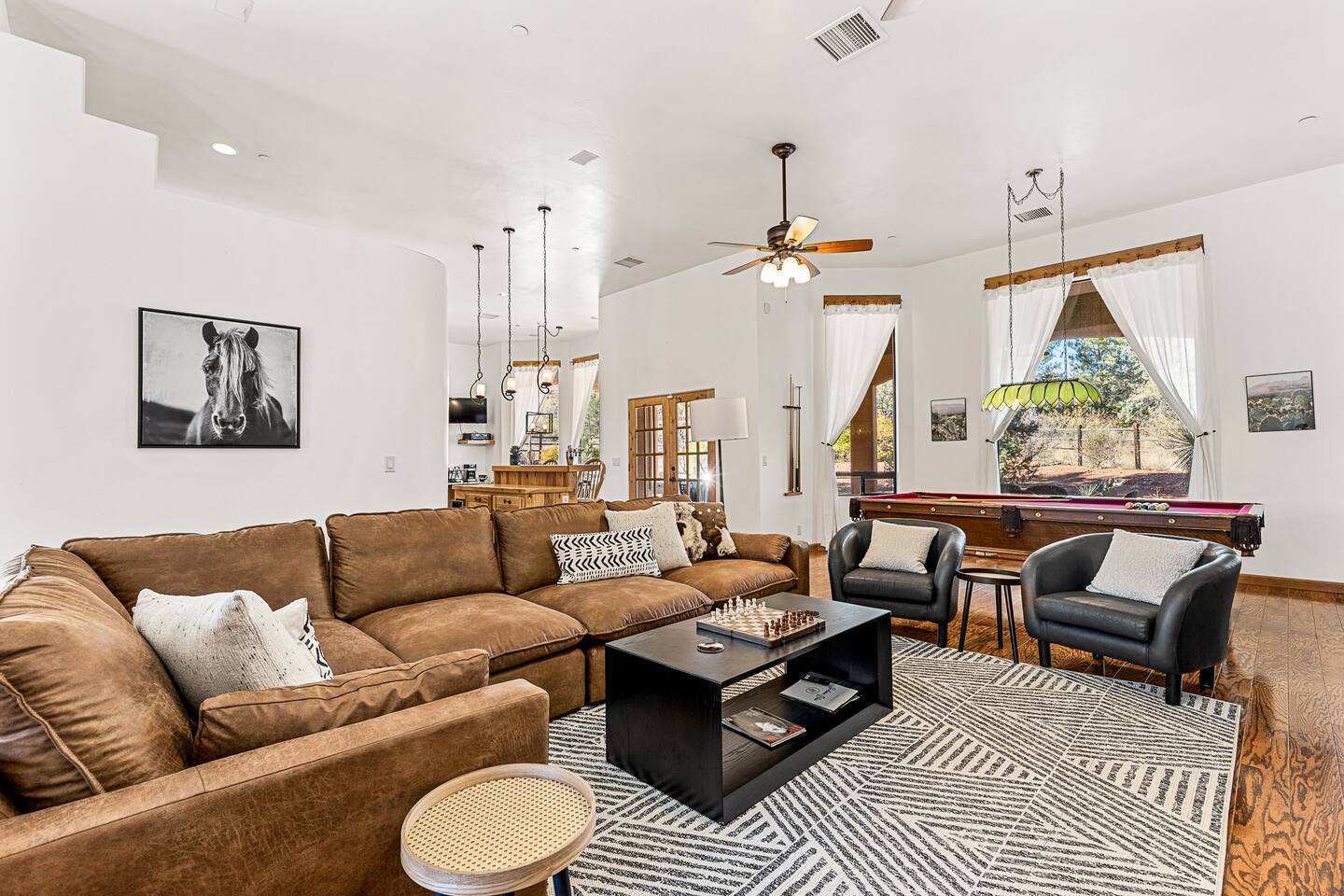 Sedona Bliss is luxury living at its finest! Bliss is defined by Webster as “complete happiness, paradise, or heaven”. Your stay at Sedona Bliss will be exactly that in our private 3850 square foot estate on a single level that was curated in Modern Cowboy décor. The property is nestled on one acre, surrounded by forest land, yet located just a few minutes from world-class hiking, trail riding, vineyards and all the other activities offered in the area. The house is located in a very quiet neighborhood. Respect for our neighbors and neighborhood are the most important thing to us. Do not book this house if you plan to be loud and disrupt our neighbors. *Absolutely no parties. The location of the property is ideal in that it is less than 5 minutes to West Sedona or 12 minutes to downtown Sedona, but away from the hustle and bustle and traffic of the city. It is on the road to Red Rock State Park (2 miles) and close to Cresent Moon Recreation area. Oak Creek Homestead OHV trail is less than .5 miles from the property. The property is also close to the booming Verde Valley Wine Trail and historic Jerome and Cottonwood. Wake up in the morning to see hot air balloons overhead! Every aspect of this home has been thoughtfully appointed and carefully curated to promote comfort, relaxation and rejuvenation. Come experience the true spiritual energy of Sedona Bliss! Our Location: Less than a 5-minute drive to Geraldo’s, Dahl & DiLuca, Café Jose, Golden Goose Grill, Local Juicery, Famous Pizza & Beer, Sedona Crepes and the always popular Vino di Sedona, with live music every night. Local hikes out of our back yard with great views of Thunder Mountain and Cathedral Rock Freedom to enjoy quick access to hiking trails while avoiding the traffic common in Uptown Sedona. Incredible stargazing and quiet solitude Only 15 minutes away from Arizona's best wineries in Cornville & Paige Springs The space Welcome to Sedona Bliss, one of Sedona’s most stunning and luxurious Airbnb properties. This extraordinary estate can sleep up to 16 people and is ideal for a family vacation or couples travelling together looking for a memorable getaway. The Rooms KITCHEN & DINING Upon entering the home, you will be greeted by the open concept kitchen, which features granite countertops and Jeannair custom built-in appliances. There is a separate Pantry between the kitchen and living room. The kitchen is a true chef’s dream. Simply put, this kitchen will make you say “WOW!” Your group will love cooking and enjoying incredible meals in this fabulous kitchen. Or, let someone else do the cooking. We can provide recommendations for a private Chef that you will enjoy while unwinding. The kitchen is equipped with 3 ovens, 6 burner gas cooktop, and built in griddle. Living Room The living room is thoughtfully laid out with enough seating for 8. There is a 65” smart tv for your enjoyment. Ambiance is provided by a gas fireplace. Pool Room Next to the living room is a pool table for your group to get their competitive juices flowing. Bar Between the Living Room and Kitchen is a bar. The bar is stocked with wine and champagne glasses. It features a 12-bottle wine refrigerator. Bedrooms & Bathrooms Each bedroom has been decorated with unique Modern Cowboy décor. ✔ High quality "oh-so" comfortable DreamCloud mattresses ✔ Luxury hotel-grade linens and pillows ✔ Black-out window treatments in all bedrooms ✔ Private spa-like bathroom in Primary Bath ✔ Deluxe style guest bathroom ✔ Washer and dryer with provided detergent All of our linens are hand selected, high quality hotel-grade white linen to ensure all of our guests have a wonderful night’s rest. Bedroom 1 (King Primary): This bedroom is located on the north end of the house with an ensuite private spa-like bathroom and two large walk-in closets. From the moment you walk in, this room will embrace you with a feeling of tranquility and sanctuary - a private oasis for you to rest and relax. Gaze out the window at the beautiful back yard or enjoy your favorite TV show on the 55” private smart TV. A gas fireplace enhances the ambiance of the room while creating warm comfort. The Primary Bathroom is outfitted with luxurious, spa-like finishes from high quality granite to a luxurious walk-in shower. The Bain Ultra jacuzzi tub offers a relaxing soak after your day of activities. The master shower is amazing, with room for 10! It has multiple shower heads including a raintree shower. There are his/hers separate vanities. The lady’s vanity has a makeup area and mirror to get ready for the day. There are his/her closets that are between the bedroom and living room that we have stocked with items needed to support a young family during their stay, including multiple pack and plays, highchairs and other items. Bedrooms 2 – 4 are located on the south side of the house. Two of the bedrooms have king mattresses, while the smaller bedroom has a queen. Each has built-in closets and storage drawers to use during your stay. All three have wall hanging televisions – with two them being 43” smart TVs. These rooms are close to the hall bath, which has two sinks and a shower Bedroom 5: Is located to the right of the main entrance. The room features two queen beds that are side by side. It also has a queen murphy bed which can be folded up during the day to create more room. This room has a unique space that we have converted into a children’s play area. We have a tent and a number of other items, including a 14 game PacMan game set. This will keep the children entertained for hours. In addition to the 3 king beds and 4 queen beds, we have a high-quality blow-up mattress allowing the home to sleep 16. Patio/Outdoors The living space opens to a huge, covered patio that extends the entire length of the house. We have installed a new 7-person hot tub on the north end of the patio. There are many different options for seating on the patio, including a conversation sea