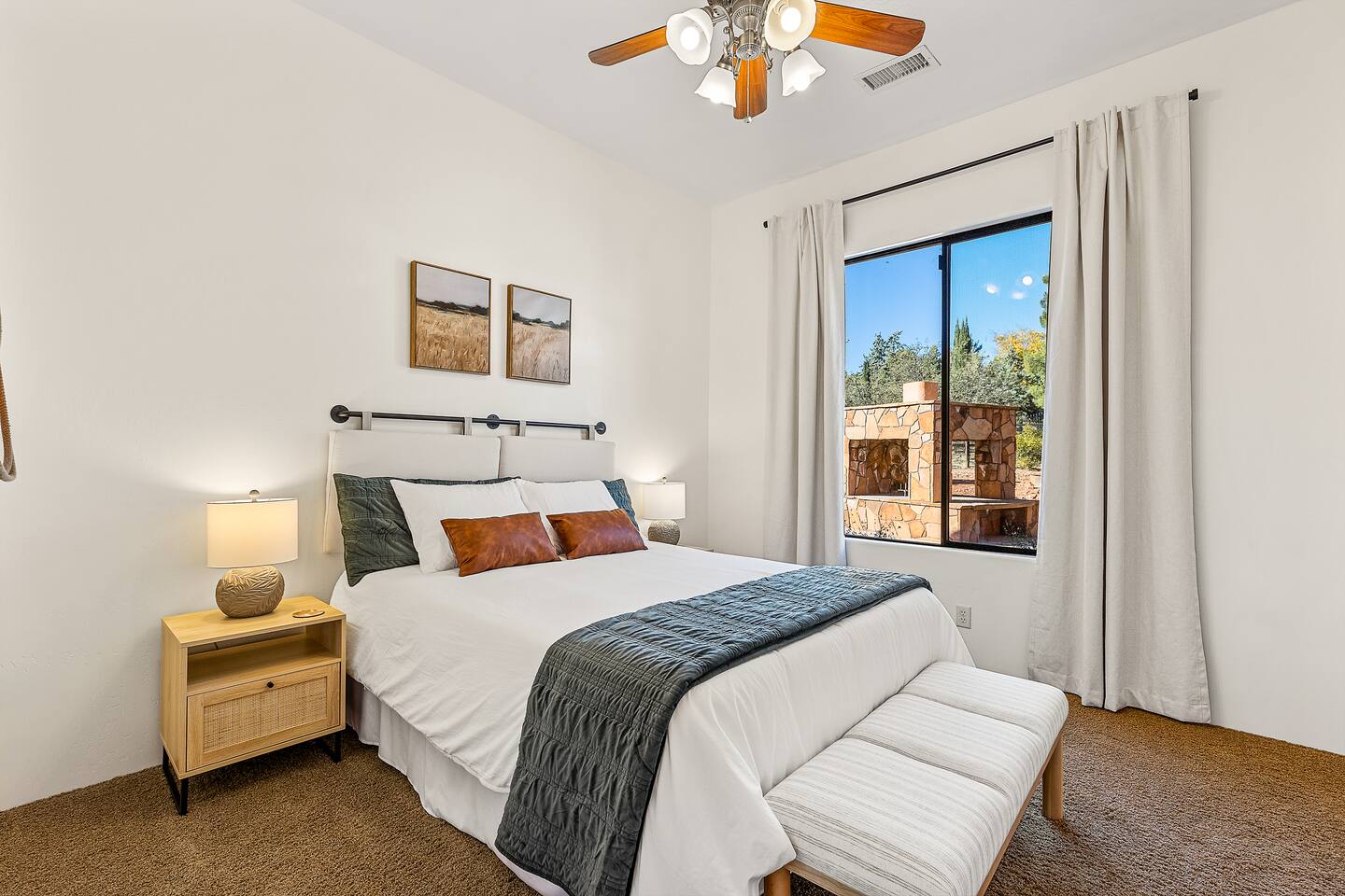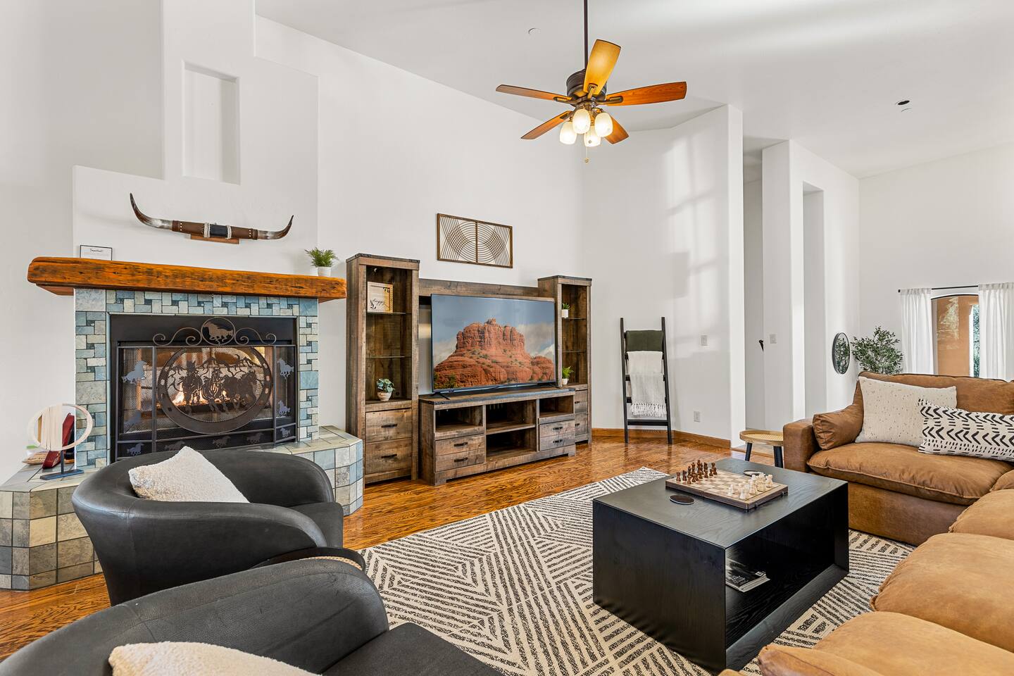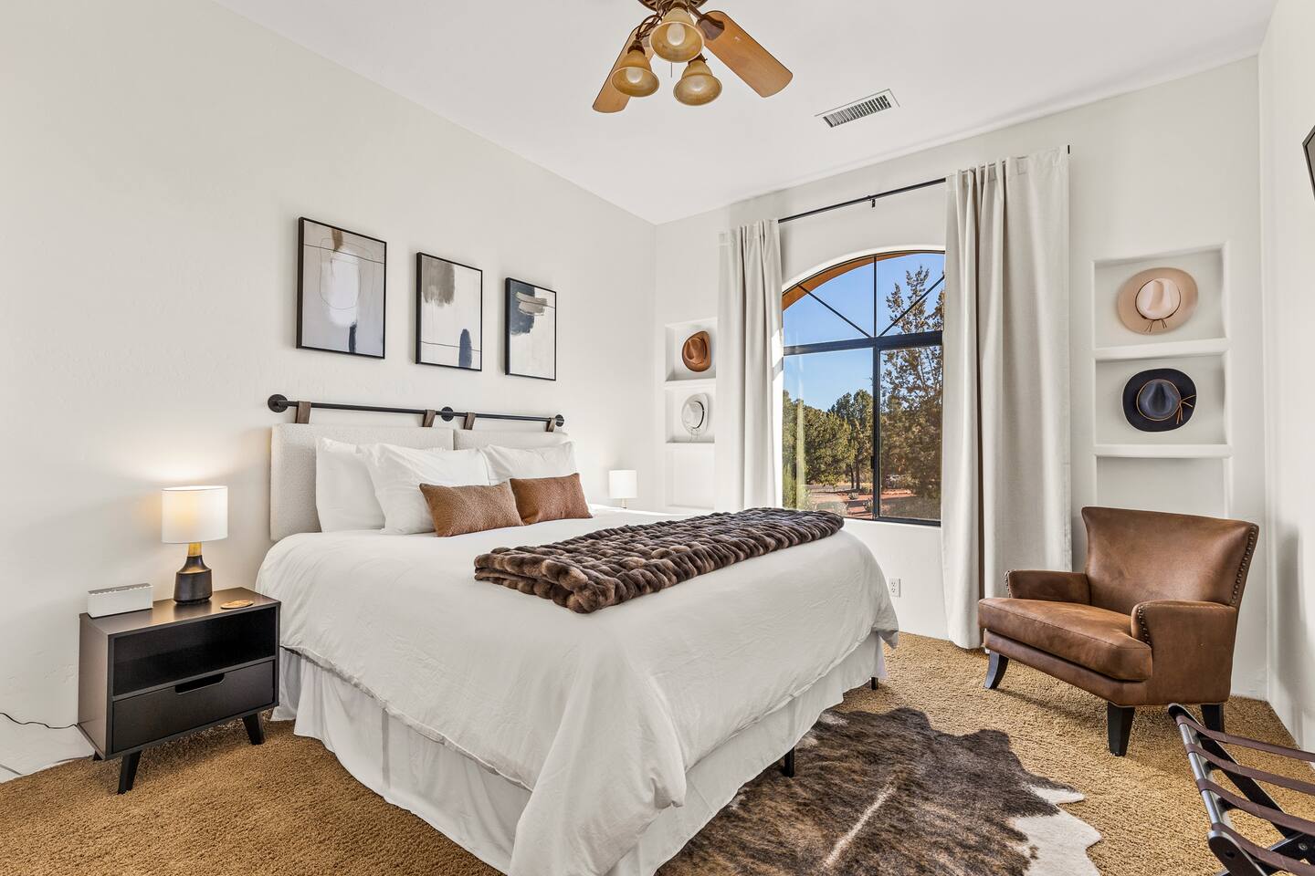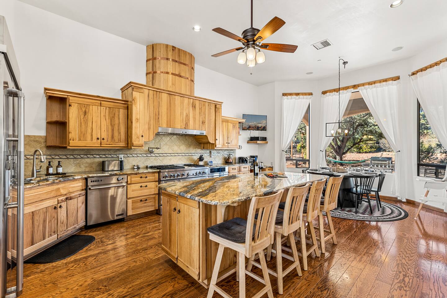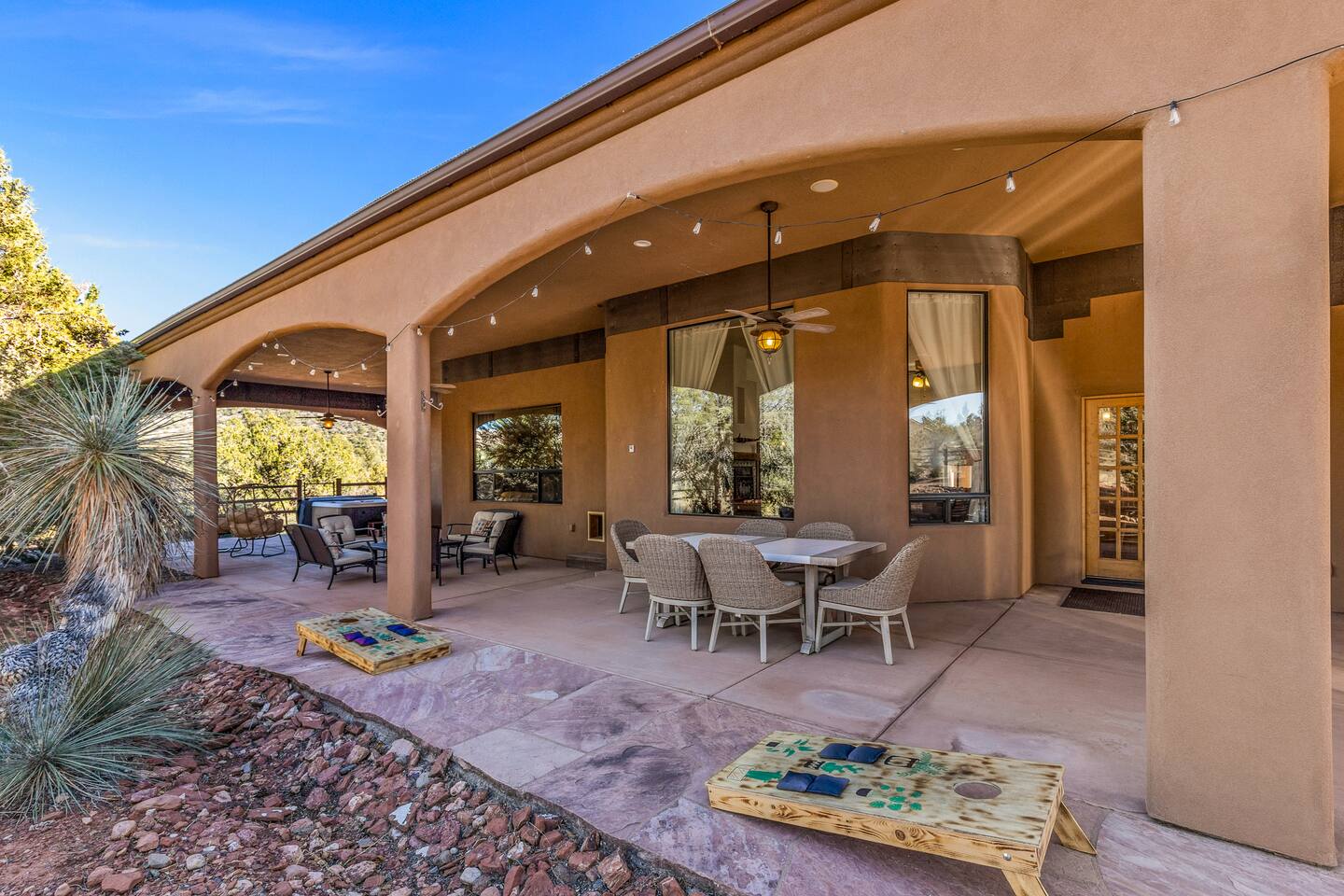 Sedona Bliss is luxury living at its finest! Bliss is defined by Webster as “complete happiness, paradise, or heaven”. Your stay at Sedona Bliss will be exactly that in our private 3850 square foot estate on a single level that was curated in Modern Cowboy décor. The property is nestled on one acre, surrounded by forest land, yet located just a few minutes from world-class hiking, trail riding, vineyards and all the other activities offered in the area. The house is located in a very quiet neighborhood. Respect for our neighbors and neighborhood are the most important thing to us. Do not book this house if you plan to be loud and disrupt our neighbors. *Absolutely no parties. The location of the property is ideal in that it is less than 5 minutes to West Sedona or 12 minutes to downtown Sedona, but away from the hustle and bustle and traffic of the city. It is on the road to Red Rock State Park (2 miles) and close to Cresent Moon Recreation area. Oak Creek Homestead OHV trail is less than .5 miles from the property. The property is also close to the booming Verde Valley Wine Trail and historic Jerome and Cottonwood. Wake up in the morning to see hot air balloons overhead! Every aspect of this home has been thoughtfully appointed and carefully curated to promote comfort, relaxation and rejuvenation. Come experience the true spiritual energy of Sedona Bliss! Our Location: Less than a 5-minute drive to Geraldo’s, Dahl & DiLuca, Café Jose, Golden Goose Grill, Local Juicery, Famous Pizza & Beer, Sedona Crepes and the always popular Vino di Sedona, with live music every night. Local hikes out of our back yard with great views of Thunder Mountain and Cathedral Rock Freedom to enjoy quick access to hiking trails while avoiding the traffic common in Uptown Sedona. Incredible stargazing and quiet solitude Only 15 minutes away from Arizona's best wineries in Cornville & Paige Springs The space Welcome to Sedona Bliss, one of Sedona’s most stunning and luxurious Airbnb properties. This extraordinary estate can sleep up to 16 people and is ideal for a family vacation or couples travelling together looking for a memorable getaway. The Rooms KITCHEN & DINING Upon entering the home, you will be greeted by the open concept kitchen, which features granite countertops and Jeannair custom built-in appliances. There is a separate Pantry between the kitchen and living room. The kitchen is a true chef’s dream. Simply put, this kitchen will make you say “WOW!” Your group will love cooking and enjoying incredible meals in this fabulous kitchen. Or, let someone else do the cooking. We can provide recommendations for a private Chef that you will enjoy while unwinding. The kitchen is equipped with 3 ovens, 6 burner gas cooktop, and built in griddle. Living Room The living room is thoughtfully laid out with enough seating for 8. There is a 65” smart tv for your enjoyment. Ambiance is provided by a gas fireplace. Pool Room Next to the living room is a pool table for your group to get their competitive juices flowing. Bar Between the Living Room and Kitchen is a bar. The bar is stocked with wine and champagne glasses. It features a 12-bottle wine refrigerator. Bedrooms & Bathrooms Each bedroom has been decorated with unique Modern Cowboy décor. ✔ High quality "oh-so" comfortable DreamCloud mattresses ✔ Luxury hotel-grade linens and pillows ✔ Black-out window treatments in all bedrooms ✔ Private spa-like bathroom in Primary Bath ✔ Deluxe style guest bathroom ✔ Washer and dryer with provided detergent All of our linens are hand selected, high quality hotel-grade white linen to ensure all of our guests have a wonderful night’s rest. Bedroom 1 (King Primary): This bedroom is located on the north end of the house with an ensuite private spa-like bathroom and two large walk-in closets. From the moment you walk in, this room will embrace you with a feeling of tranquility and sanctuary - a private oasis for you to rest and relax. Gaze out the window at the beautiful back yard or enjoy your favorite TV show on the 55” private smart TV. A gas fireplace enhances the ambiance of the room while creating warm comfort. The Primary Bathroom is outfitted with luxurious, spa-like finishes from high quality granite to a luxurious walk-in shower. The Bain Ultra jacuzzi tub offers a relaxing soak after your day of activities. The master shower is amazing, with room for 10! It has multiple shower heads including a raintree shower. There are his/hers separate vanities. The lady’s vanity has a makeup area and mirror to get ready for the day. There are his/her closets that are between the bedroom and living room that we have stocked with items needed to support a young family during their stay, including multiple pack and plays, highchairs and other items. Bedrooms 2 – 4 are located on the south side of the house. Two of the bedrooms have king mattresses, while the smaller bedroom has a queen. Each has built-in closets and storage drawers to use during your stay. All three have wall hanging televisions – with two them being 43” smart TVs. These rooms are close to the hall bath, which has two sinks and a shower Bedroom 5: Is located to the right of the main entrance. The room features two queen beds that are side by side. It also has a queen murphy bed which can be folded up during the day to create more room. This room has a unique space that we have converted into a children’s play area. We have a tent and a number of other items, including a 14 game PacMan game set. This will keep the children entertained for hours. In addition to the 3 king beds and 4 queen beds, we have a high-quality blow-up mattress allowing the home to sleep 16. Patio/Outdoors The living space opens to a huge, covered patio that extends the entire length of the house. We have installed a new 7-person hot tub on the north end of the patio. There are many different options for seating on the patio, including a conversation sea