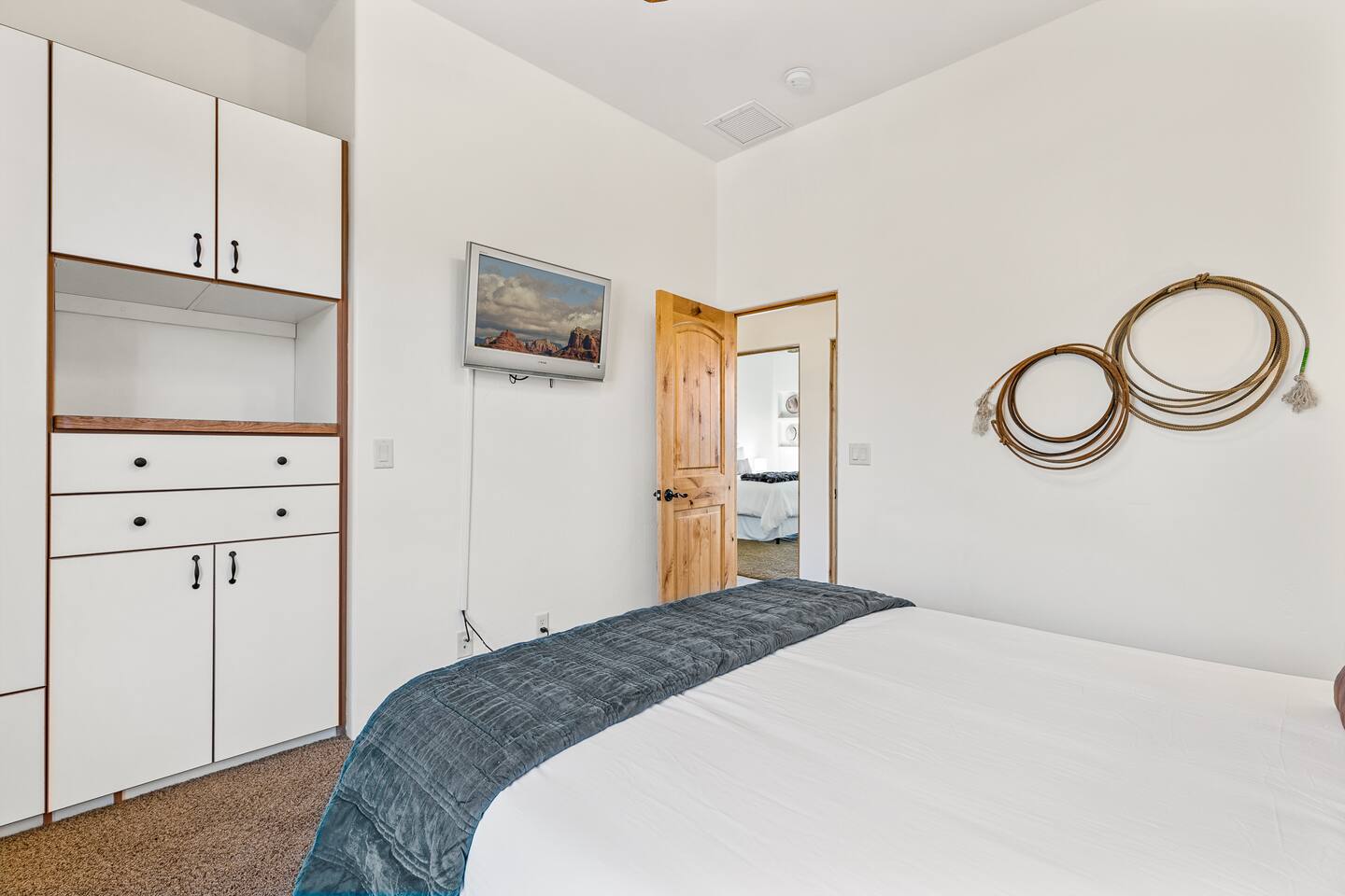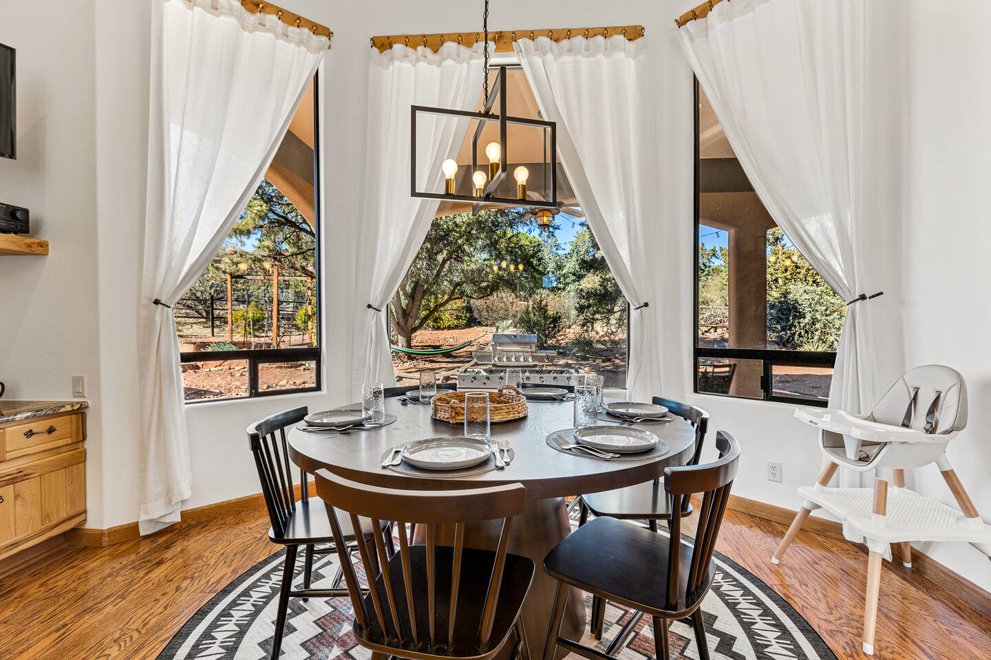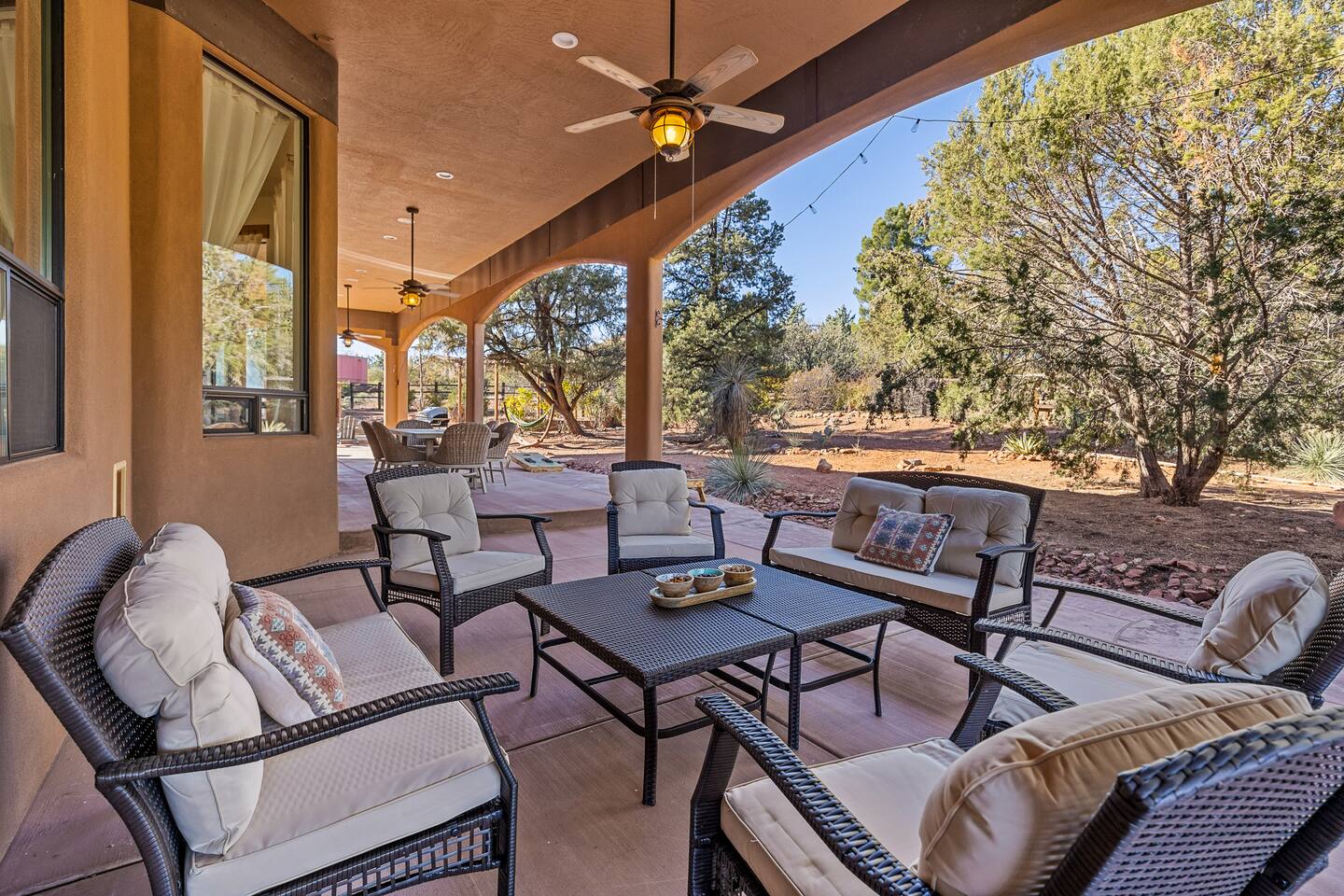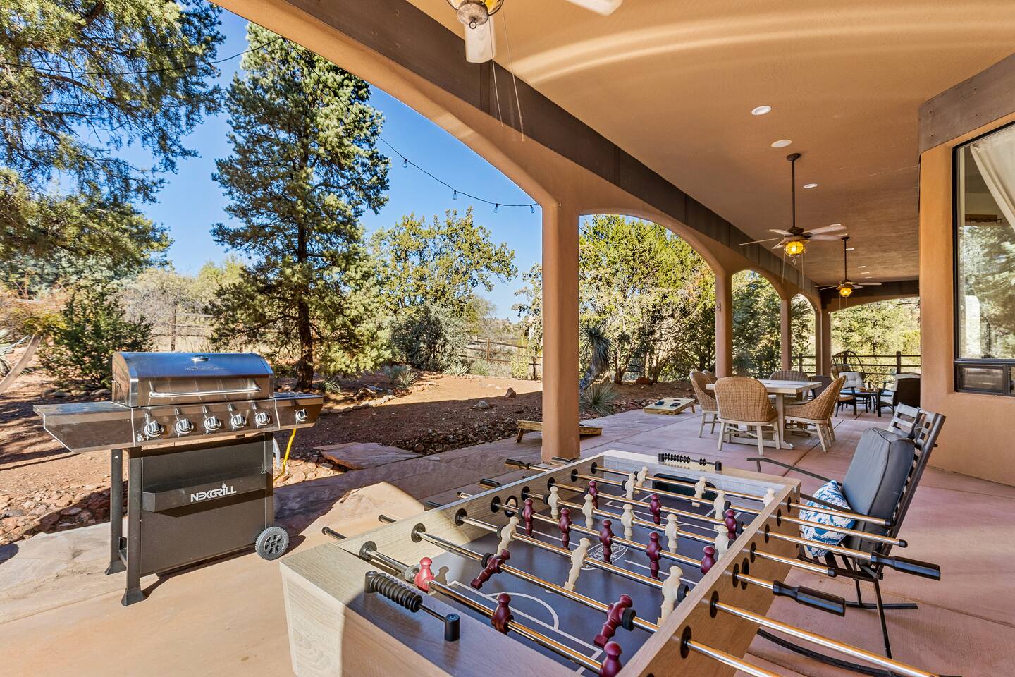 Sedona Bliss is luxury living at its finest! Bliss is defined by Webster as “complete happiness, paradise, or heaven”. Your stay at Sedona Bliss will be exactly that in our private 3850 square foot estate on a single level that was curated in Modern Cowboy décor. The property is nestled on one acre, surrounded by forest land, yet located just a few minutes from world-class hiking, trail riding, vineyards and all the other activities offered in the area. The house is located in a very quiet neighborhood. Respect for our neighbors and neighborhood are the most important thing to us. Do not book this house if you plan to be loud and disrupt our neighbors. *Absolutely no parties. The location of the property is ideal in that it is less than 5 minutes to West Sedona or 12 minutes to downtown Sedona, but away from the hustle and bustle and traffic of the city. It is on the road to Red Rock State Park (2 miles) and close to Cresent Moon Recreation area. Oak Creek Homestead OHV trail is less than .5 miles from the property. The property is also close to the booming Verde Valley Wine Trail and historic Jerome and Cottonwood. Wake up in the morning to see hot air balloons overhead! Every aspect of this home has been thoughtfully appointed and carefully curated to promote comfort, relaxation and rejuvenation. Come experience the true spiritual energy of Sedona Bliss! Our Location: Less than a 5-minute drive to Geraldo’s, Dahl & DiLuca, Café Jose, Golden Goose Grill, Local Juicery, Famous Pizza & Beer, Sedona Crepes and the always popular Vino di Sedona, with live music every night. Local hikes out of our back yard with great views of Thunder Mountain and Cathedral Rock Freedom to enjoy quick access to hiking trails while avoiding the traffic common in Uptown Sedona. Incredible stargazing and quiet solitude Only 15 minutes away from Arizona's best wineries in Cornville & Paige Springs The space Welcome to Sedona Bliss, one of Sedona’s most stunning and luxurious Airbnb properties. This extraordinary estate can sleep up to 16 people and is ideal for a family vacation or couples travelling together looking for a memorable getaway. The Rooms KITCHEN & DINING Upon entering the home, you will be greeted by the open concept kitchen, which features granite countertops and Jeannair custom built-in appliances. There is a separate Pantry between the kitchen and living room. The kitchen is a true chef’s dream. Simply put, this kitchen will make you say “WOW!” Your group will love cooking and enjoying incredible meals in this fabulous kitchen. Or, let someone else do the cooking. We can provide recommendations for a private Chef that you will enjoy while unwinding. The kitchen is equipped with 3 ovens, 6 burner gas cooktop, and built in griddle. Living Room The living room is thoughtfully laid out with enough seating for 8. There is a 65” smart tv for your enjoyment. Ambiance is provided by a gas fireplace. Pool Room Next to the living room is a pool table for your group to get their competitive juices flowing. Bar Between the Living Room and Kitchen is a bar. The bar is stocked with wine and champagne glasses. It features a 12-bottle wine refrigerator. Bedrooms & Bathrooms Each bedroom has been decorated with unique Modern Cowboy décor. ✔ High quality "oh-so" comfortable DreamCloud mattresses ✔ Luxury hotel-grade linens and pillows ✔ Black-out window treatments in all bedrooms ✔ Private spa-like bathroom in Primary Bath ✔ Deluxe style guest bathroom ✔ Washer and dryer with provided detergent All of our linens are hand selected, high quality hotel-grade white linen to ensure all of our guests have a wonderful night’s rest. Bedroom 1 (King Primary): This bedroom is located on the north end of the house with an ensuite private spa-like bathroom and two large walk-in closets. From the moment you walk in, this room will embrace you with a feeling of tranquility and sanctuary - a private oasis for you to rest and relax. Gaze out the window at the beautiful back yard or enjoy your favorite TV show on the 55” private smart TV. A gas fireplace enhances the ambiance of the room while creating warm comfort. The Primary Bathroom is outfitted with luxurious, spa-like finishes from high quality granite to a luxurious walk-in shower. The Bain Ultra jacuzzi tub offers a relaxing soak after your day of activities. The master shower is amazing, with room for 10! It has multiple shower heads including a raintree shower. There are his/hers separate vanities. The lady’s vanity has a makeup area and mirror to get ready for the day. There are his/her closets that are between the bedroom and living room that we have stocked with items needed to support a young family during their stay, including multiple pack and plays, highchairs and other items. Bedrooms 2 – 4 are located on the south side of the house. Two of the bedrooms have king mattresses, while the smaller bedroom has a queen. Each has built-in closets and storage drawers to use during your stay. All three have wall hanging televisions – with two them being 43” smart TVs. These rooms are close to the hall bath, which has two sinks and a shower Bedroom 5: Is located to the right of the main entrance. The room features two queen beds that are side by side. It also has a queen murphy bed which can be folded up during the day to create more room. This room has a unique space that we have converted into a children’s play area. We have a tent and a number of other items, including a 14 game PacMan game set. This will keep the children entertained for hours. In addition to the 3 king beds and 4 queen beds, we have a high-quality blow-up mattress allowing the home to sleep 16. Patio/Outdoors The living space opens to a huge, covered patio that extends the entire length of the house. We have installed a new 7-person hot tub on the north end of the patio. There are many different options for seating on the patio, including a conversation sea