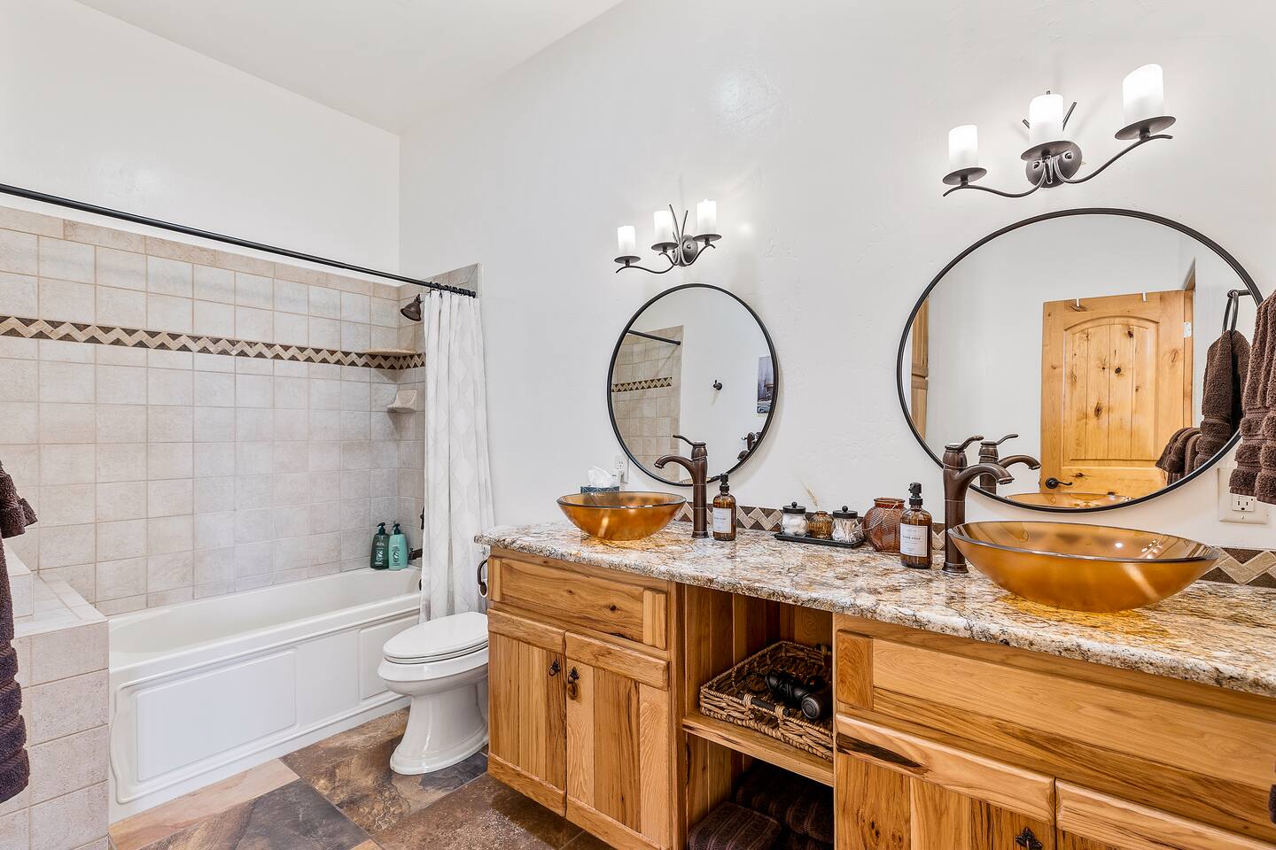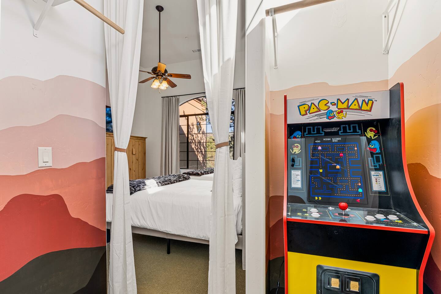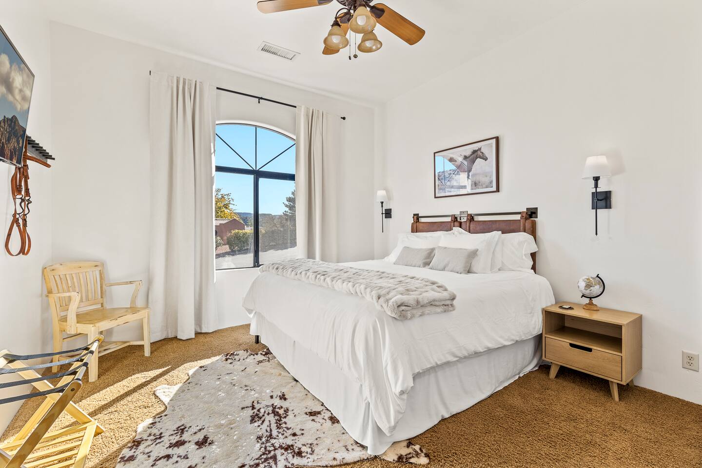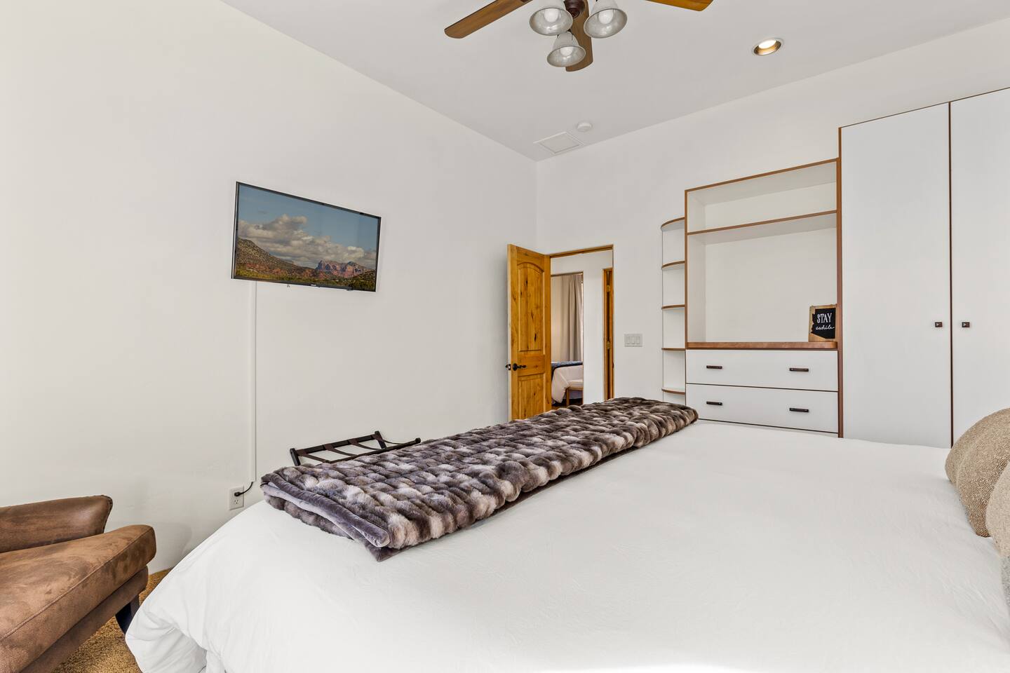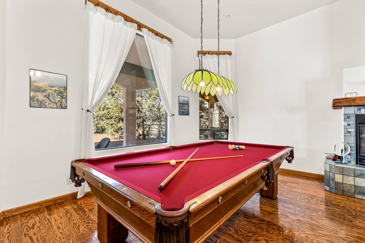 Sedona Bliss is luxury living at its finest! Bliss is defined by Webster as “complete happiness, paradise, or heaven”. Your stay at Sedona Bliss will be exactly that in our private 3850 square foot estate on a single level that was curated in Modern Cowboy décor. The property is nestled on one acre, surrounded by forest land, yet located just a few minutes from world-class hiking, trail riding, vineyards and all the other activities offered in the area. The house is located in a very quiet neighborhood. Respect for our neighbors and neighborhood are the most important thing to us. Do not book this house if you plan to be loud and disrupt our neighbors. *Absolutely no parties. The location of the property is ideal in that it is less than 5 minutes to West Sedona or 12 minutes to downtown Sedona, but away from the hustle and bustle and traffic of the city. It is on the road to Red Rock State Park (2 miles) and close to Cresent Moon Recreation area. Oak Creek Homestead OHV trail is less than .5 miles from the property. The property is also close to the booming Verde Valley Wine Trail and historic Jerome and Cottonwood. Wake up in the morning to see hot air balloons overhead! Every aspect of this home has been thoughtfully appointed and carefully curated to promote comfort, relaxation and rejuvenation. Come experience the true spiritual energy of Sedona Bliss! Our Location: Less than a 5-minute drive to Geraldo’s, Dahl & DiLuca, Café Jose, Golden Goose Grill, Local Juicery, Famous Pizza & Beer, Sedona Crepes and the always popular Vino di Sedona, with live music every night. Local hikes out of our back yard with great views of Thunder Mountain and Cathedral Rock Freedom to enjoy quick access to hiking trails while avoiding the traffic common in Uptown Sedona. Incredible stargazing and quiet solitude Only 15 minutes away from Arizona's best wineries in Cornville & Paige Springs The space Welcome to Sedona Bliss, one of Sedona’s most stunning and luxurious Airbnb properties. This extraordinary estate can sleep up to 16 people and is ideal for a family vacation or couples travelling together looking for a memorable getaway. The Rooms KITCHEN & DINING Upon entering the home, you will be greeted by the open concept kitchen, which features granite countertops and Jeannair custom built-in appliances. There is a separate Pantry between the kitchen and living room. The kitchen is a true chef’s dream. Simply put, this kitchen will make you say “WOW!” Your group will love cooking and enjoying incredible meals in this fabulous kitchen. Or, let someone else do the cooking. We can provide recommendations for a private Chef that you will enjoy while unwinding. The kitchen is equipped with 3 ovens, 6 burner gas cooktop, and built in griddle. Living Room The living room is thoughtfully laid out with enough seating for 8. There is a 65” smart tv for your enjoyment. Ambiance is provided by a gas fireplace. Pool Room Next to the living room is a pool table for your group to get their competitive juices flowing. Bar Between the Living Room and Kitchen is a bar. The bar is stocked with wine and champagne glasses. It features a 12-bottle wine refrigerator. Bedrooms & Bathrooms Each bedroom has been decorated with unique Modern Cowboy décor. ✔ High quality "oh-so" comfortable DreamCloud mattresses ✔ Luxury hotel-grade linens and pillows ✔ Black-out window treatments in all bedrooms ✔ Private spa-like bathroom in Primary Bath ✔ Deluxe style guest bathroom ✔ Washer and dryer with provided detergent All of our linens are hand selected, high quality hotel-grade white linen to ensure all of our guests have a wonderful night’s rest. Bedroom 1 (King Primary): This bedroom is located on the north end of the house with an ensuite private spa-like bathroom and two large walk-in closets. From the moment you walk in, this room will embrace you with a feeling of tranquility and sanctuary - a private oasis for you to rest and relax. Gaze out the window at the beautiful back yard or enjoy your favorite TV show on the 55” private smart TV. A gas fireplace enhances the ambiance of the room while creating warm comfort. The Primary Bathroom is outfitted with luxurious, spa-like finishes from high quality granite to a luxurious walk-in shower. The Bain Ultra jacuzzi tub offers a relaxing soak after your day of activities. The master shower is amazing, with room for 10! It has multiple shower heads including a raintree shower. There are his/hers separate vanities. The lady’s vanity has a makeup area and mirror to get ready for the day. There are his/her closets that are between the bedroom and living room that we have stocked with items needed to support a young family during their stay, including multiple pack and plays, highchairs and other items. Bedrooms 2 – 4 are located on the south side of the house. Two of the bedrooms have king mattresses, while the smaller bedroom has a queen. Each has built-in closets and storage drawers to use during your stay. All three have wall hanging televisions – with two them being 43” smart TVs. These rooms are close to the hall bath, which has two sinks and a shower Bedroom 5: Is located to the right of the main entrance. The room features two queen beds that are side by side. It also has a queen murphy bed which can be folded up during the day to create more room. This room has a unique space that we have converted into a children’s play area. We have a tent and a number of other items, including a 14 game PacMan game set. This will keep the children entertained for hours. In addition to the 3 king beds and 4 queen beds, we have a high-quality blow-up mattress allowing the home to sleep 16. Patio/Outdoors The living space opens to a huge, covered patio that extends the entire length of the house. We have installed a new 7-person hot tub on the north end of the patio. There are many different options for seating on the patio, including a conversation sea