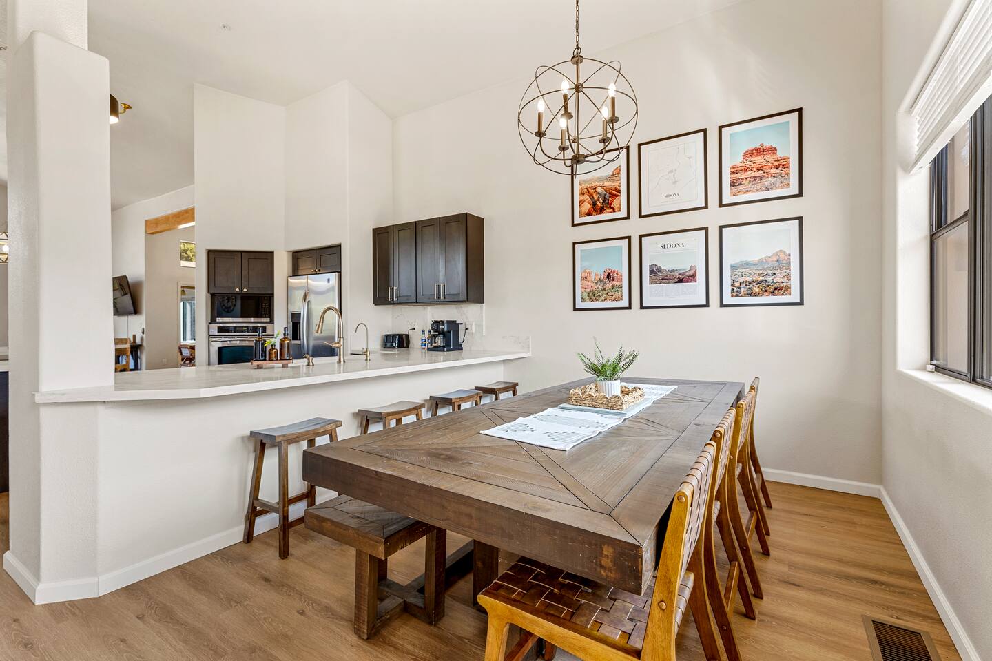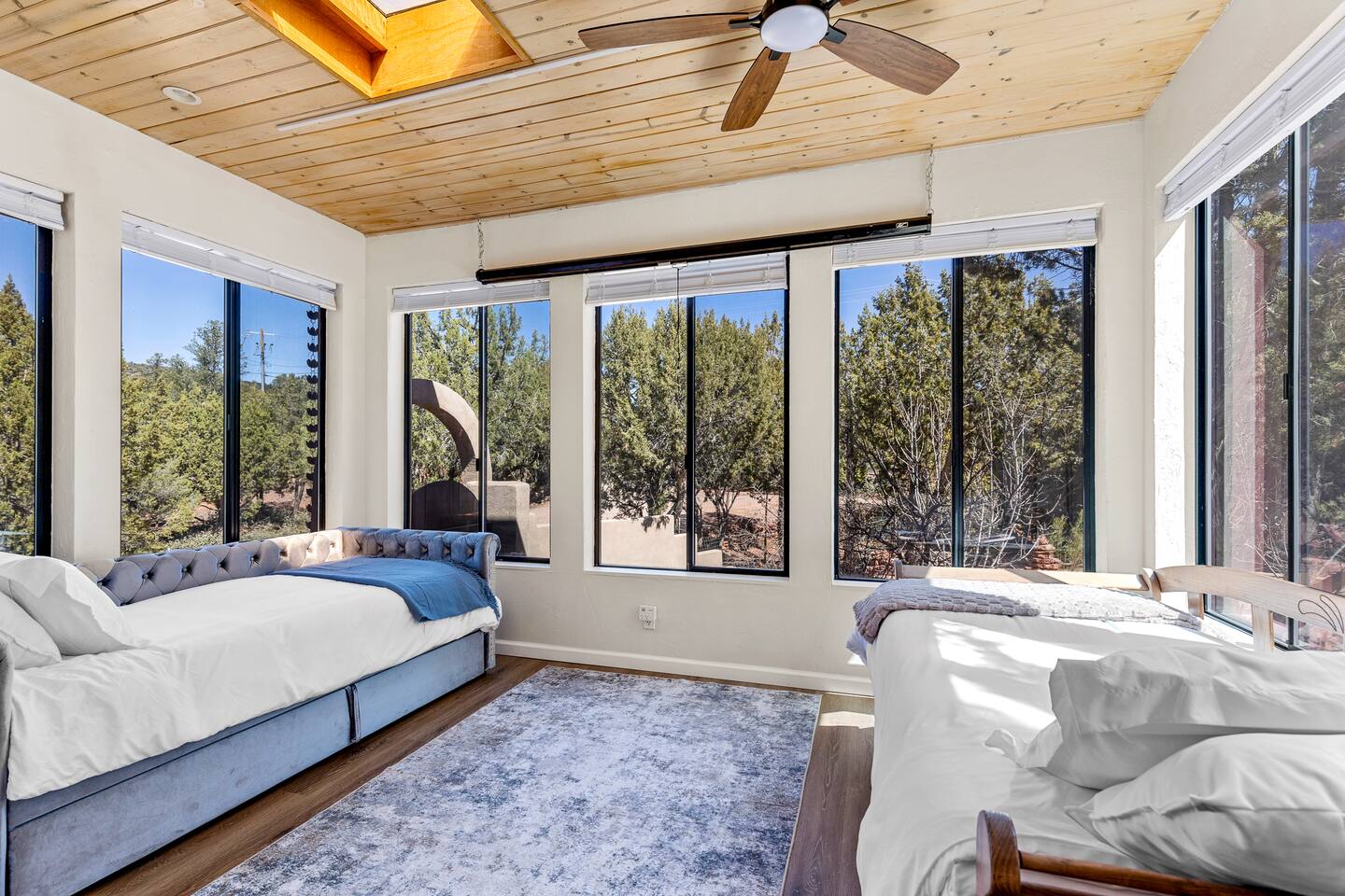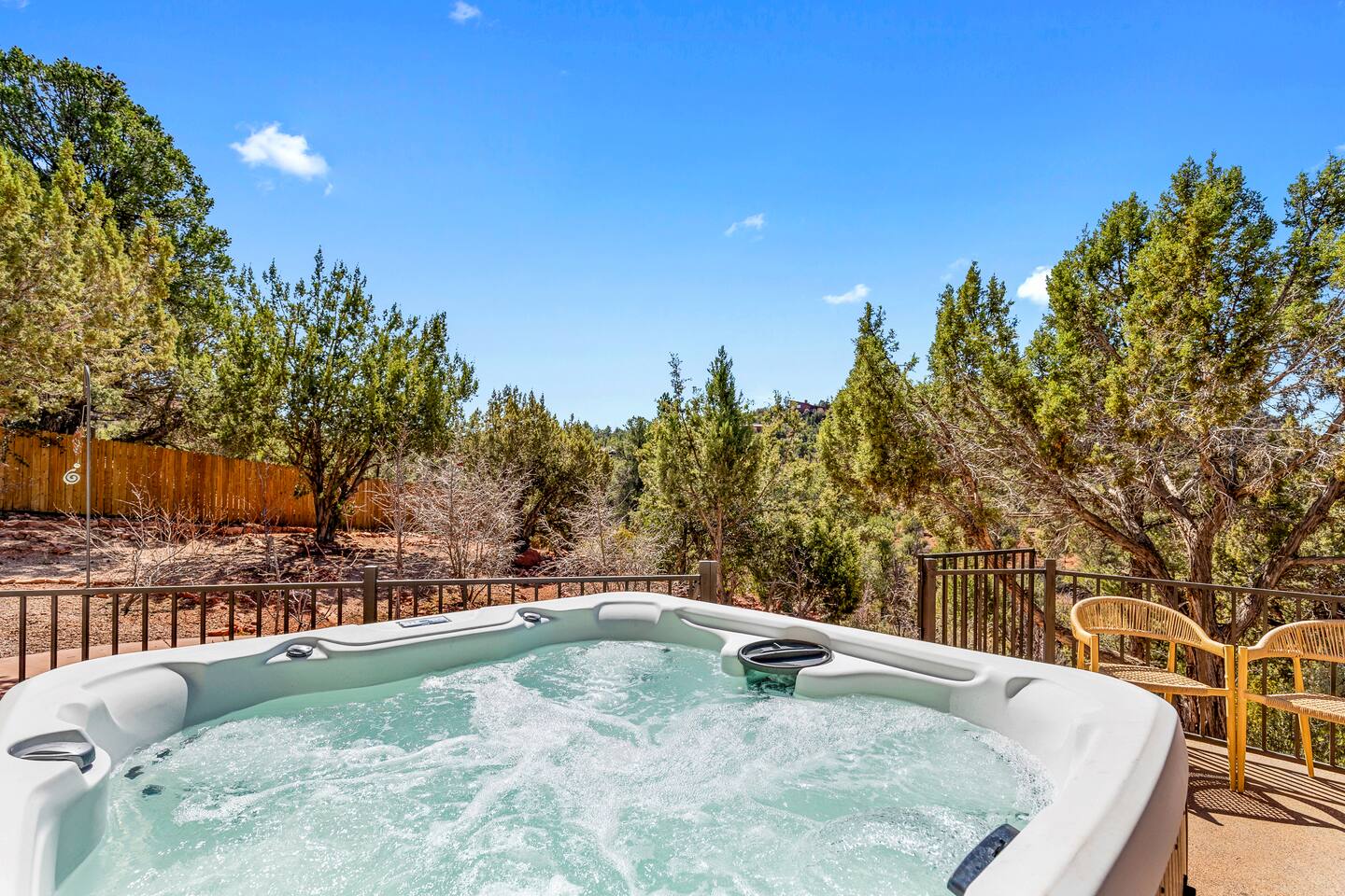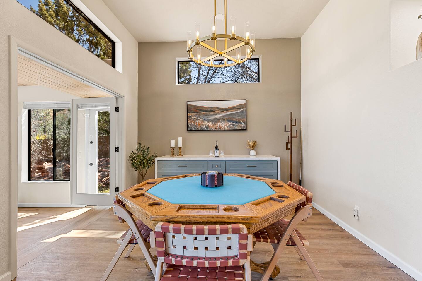 Location: Ideally located for those looking to explore all that Sedona has to offer, this home is just minutes away from hiking trails, scenic viewpoints, and local attractions like the Chapel of the Holy Cross. Dining, shopping, and art galleries are also nearby, providing the best of both adventure and culture. The house is close to all of the main Sedona attractions, including: Chapel of the Holy Cross - 1.3 miles Cathedral Rock - 1.6 miles Bell Rock - 1 mile Downtown Sedona - 3 miles Tlaquepaque Mall - 2.5 miles Oak Creek - 20 min hike (there is a trail out of the back of our property that goes down to Oak Creek) The Space Set on almost an acre property, you will find an abundance of fruit trees in the landscaped yard! Living Room: Step into the bright and airy living room, where large windows allow natural light to flood the space and offer sweeping views of the surrounding red rocks. The room features plush seating for the whole group, a cozy atmosphere, and a smart TV with streaming services to unwind after a day of adventure. Kitchen & Dining Area: Prepare your meals in the state-of-the-art kitchen, fully equipped with premium stainless steel appliances, including a gas stove, microwave, and dishwasher. A spacious island provides additional prep space, while the adjacent dining area, with seating for 8 plus, invites family meals and entertaining. Bedrooms: Master Bedroom: Enjoy privacy and comfort in the master suite, which boasts a king-sized bed, a stylish en-suite bathroom with a walk-in shower, double vanities, and a large walk-in closet. Bedroom 2: This room features a king-sized bed, tastefully decorated, and offers great views of the surrounding landscape. Bedroom 3: Perfect for families, this room has a twin trundle bed and a queen bed (to sleep 4 people) with ample space for relaxation. Bedroom 4: A king-sized bed with cozy linens, connected bathroom and a serene ambiance. Bedroom 5: This spacious room offers a twin-sized bed and a twin trundle bed (sleeps 3) and is ideal for lounging on the couch or doing some yoga. Bathrooms: The master bathroom features a luxurious walk-in shower with rain shower head and free-standing soak tub. A second full bathroom is located near the additional bedrooms, offering an upscale shower. A third bathroom serves the lower living areas and is designed with high-end finishes and includes a shower/tub combo. Entertainment and Amenities: Sauna: After a day of hiking or sightseeing, unwind in the private sauna, the perfect spot to relax and recharge. Hot Tub: Soak under the stars in the outdoor hot tub, an ideal way to enjoy Sedona’s beautiful evenings. Poker Table: For a fun night in, gather around the poker table for friendly competition and games. Arcade: The sunroom includes a vintage arcade setup, providing hours of entertainment for kids and adults alike. Projector System: Experience movie nights like never before with a state-of-the-art projector system and large screen, perfect for creating a home theater experience. Outdoor Space: Step outside to your private backyard, where you can lounge on the comfortable seating or cook up a meal on the BBQ. The space is ideal for al fresco dining, sunbathing, or enjoying the beautiful views. Whether you're relaxing or hosting a gathering, the backyard offers the perfect setting. Additional Amenities: Fast, free Wi-Fi Air conditioning and heating Laundry facilities (washer/dryer) Free parking High-quality linens and towels Smart TV with streaming services Book your stay at Castle Rock Retreat and experience the beauty and serenity of Sedona in a home that offers the ultimate in relaxation, entertainment, and comfort.