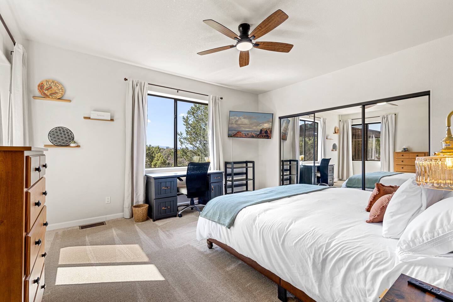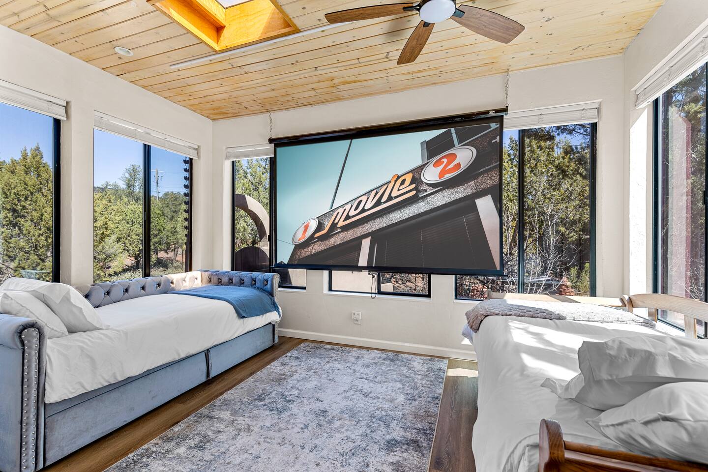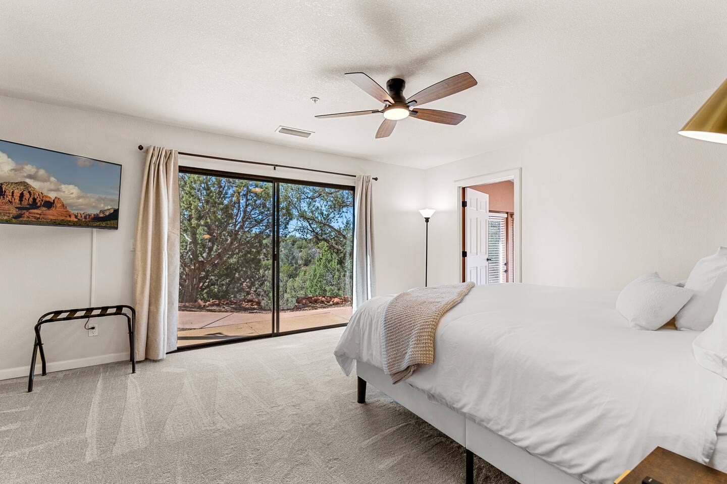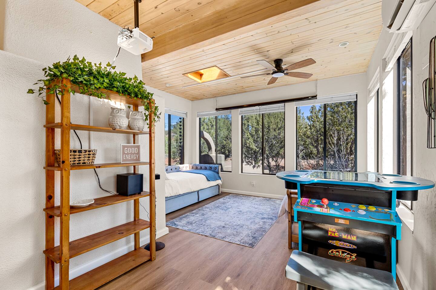 Location: Ideally located for those looking to explore all that Sedona has to offer, this home is just minutes away from hiking trails, scenic viewpoints, and local attractions like the Chapel of the Holy Cross. Dining, shopping, and art galleries are also nearby, providing the best of both adventure and culture. The house is close to all of the main Sedona attractions, including: Chapel of the Holy Cross - 1.3 miles Cathedral Rock - 1.6 miles Bell Rock - 1 mile Downtown Sedona - 3 miles Tlaquepaque Mall - 2.5 miles Oak Creek - 20 min hike (there is a trail out of the back of our property that goes down to Oak Creek) The Space Set on almost an acre property, you will find an abundance of fruit trees in the landscaped yard! Living Room: Step into the bright and airy living room, where large windows allow natural light to flood the space and offer sweeping views of the surrounding red rocks. The room features plush seating for the whole group, a cozy atmosphere, and a smart TV with streaming services to unwind after a day of adventure. Kitchen & Dining Area: Prepare your meals in the state-of-the-art kitchen, fully equipped with premium stainless steel appliances, including a gas stove, microwave, and dishwasher. A spacious island provides additional prep space, while the adjacent dining area, with seating for 8 plus, invites family meals and entertaining. Bedrooms: Master Bedroom: Enjoy privacy and comfort in the master suite, which boasts a king-sized bed, a stylish en-suite bathroom with a walk-in shower, double vanities, and a large walk-in closet. Bedroom 2: This room features a king-sized bed, tastefully decorated, and offers great views of the surrounding landscape. Bedroom 3: Perfect for families, this room has a twin trundle bed and a queen bed (to sleep 4 people) with ample space for relaxation. Bedroom 4: A king-sized bed with cozy linens, connected bathroom and a serene ambiance. Bedroom 5: This spacious room offers a twin-sized bed and a twin trundle bed (sleeps 3) and is ideal for lounging on the couch or doing some yoga. Bathrooms: The master bathroom features a luxurious walk-in shower with rain shower head and free-standing soak tub. A second full bathroom is located near the additional bedrooms, offering an upscale shower. A third bathroom serves the lower living areas and is designed with high-end finishes and includes a shower/tub combo. Entertainment and Amenities: Sauna: After a day of hiking or sightseeing, unwind in the private sauna, the perfect spot to relax and recharge. Hot Tub: Soak under the stars in the outdoor hot tub, an ideal way to enjoy Sedona’s beautiful evenings. Poker Table: For a fun night in, gather around the poker table for friendly competition and games. Arcade: The sunroom includes a vintage arcade setup, providing hours of entertainment for kids and adults alike. Projector System: Experience movie nights like never before with a state-of-the-art projector system and large screen, perfect for creating a home theater experience. Outdoor Space: Step outside to your private backyard, where you can lounge on the comfortable seating or cook up a meal on the BBQ. The space is ideal for al fresco dining, sunbathing, or enjoying the beautiful views. Whether you're relaxing or hosting a gathering, the backyard offers the perfect setting. Additional Amenities: Fast, free Wi-Fi Air conditioning and heating Laundry facilities (washer/dryer) Free parking High-quality linens and towels Smart TV with streaming services Book your stay at Castle Rock Retreat and experience the beauty and serenity of Sedona in a home that offers the ultimate in relaxation, entertainment, and comfort.