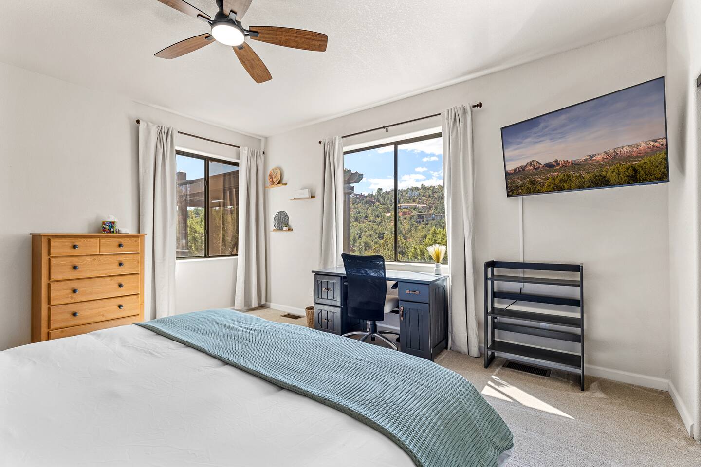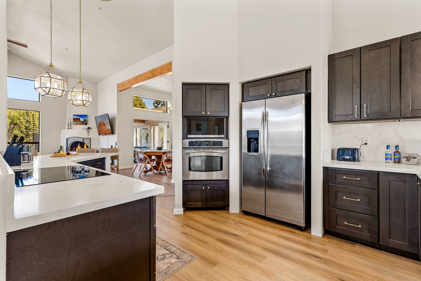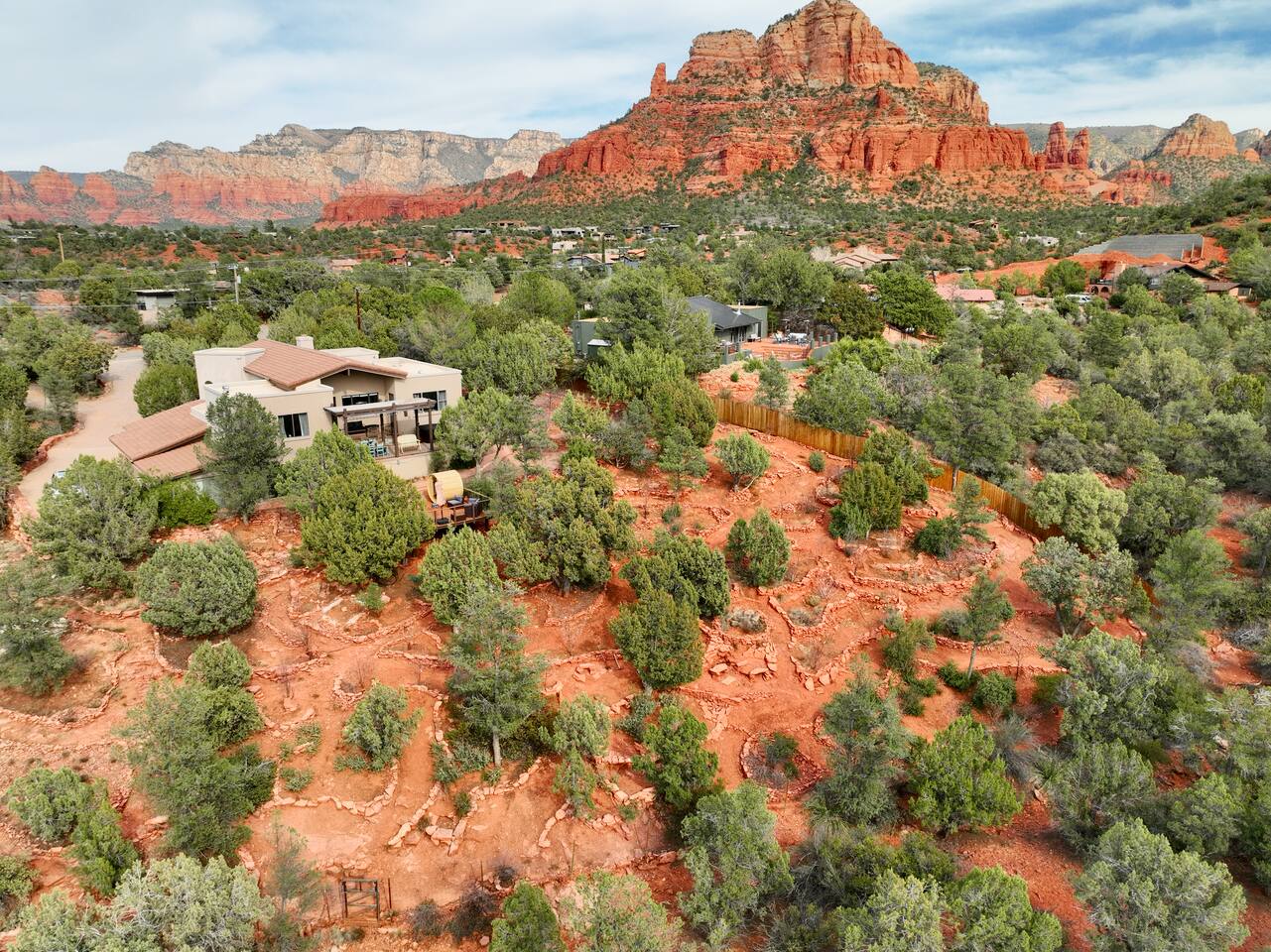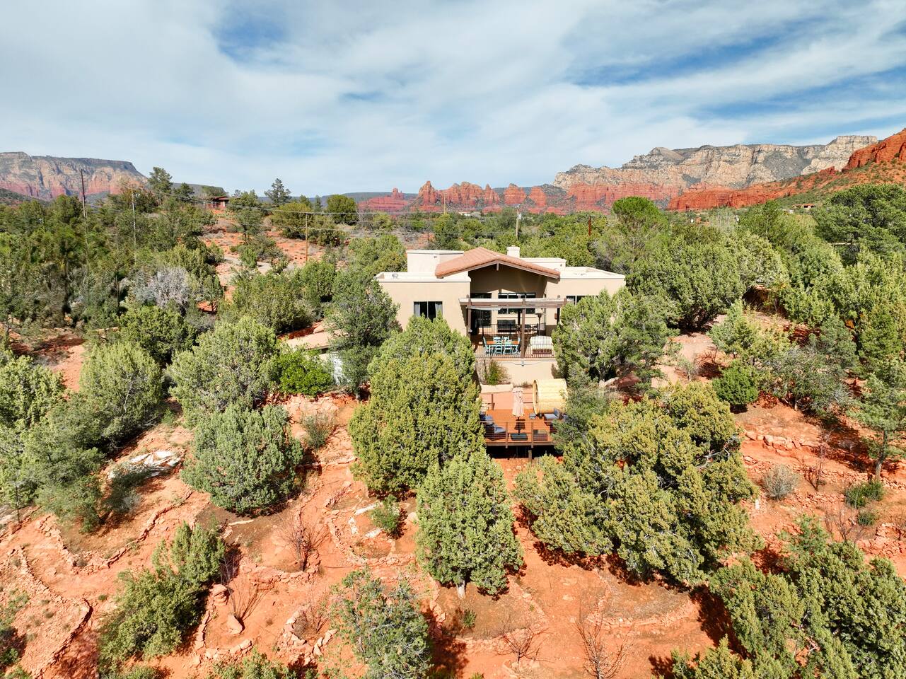 Location: Ideally located for those looking to explore all that Sedona has to offer, this home is just minutes away from hiking trails, scenic viewpoints, and local attractions like the Chapel of the Holy Cross. Dining, shopping, and art galleries are also nearby, providing the best of both adventure and culture. The house is close to all of the main Sedona attractions, including: Chapel of the Holy Cross - 1.3 miles Cathedral Rock - 1.6 miles Bell Rock - 1 mile Downtown Sedona - 3 miles Tlaquepaque Mall - 2.5 miles Oak Creek - 20 min hike (there is a trail out of the back of our property that goes down to Oak Creek) The Space Set on almost an acre property, you will find an abundance of fruit trees in the landscaped yard! Living Room: Step into the bright and airy living room, where large windows allow natural light to flood the space and offer sweeping views of the surrounding red rocks. The room features plush seating for the whole group, a cozy atmosphere, and a smart TV with streaming services to unwind after a day of adventure. Kitchen & Dining Area: Prepare your meals in the state-of-the-art kitchen, fully equipped with premium stainless steel appliances, including a gas stove, microwave, and dishwasher. A spacious island provides additional prep space, while the adjacent dining area, with seating for 8 plus, invites family meals and entertaining. Bedrooms: Master Bedroom: Enjoy privacy and comfort in the master suite, which boasts a king-sized bed, a stylish en-suite bathroom with a walk-in shower, double vanities, and a large walk-in closet. Bedroom 2: This room features a king-sized bed, tastefully decorated, and offers great views of the surrounding landscape. Bedroom 3: Perfect for families, this room has a twin trundle bed and a queen bed (to sleep 4 people) with ample space for relaxation. Bedroom 4: A king-sized bed with cozy linens, connected bathroom and a serene ambiance. Bedroom 5: This spacious room offers a twin-sized bed and a twin trundle bed (sleeps 3) and is ideal for lounging on the couch or doing some yoga. Bathrooms: The master bathroom features a luxurious walk-in shower with rain shower head and free-standing soak tub. A second full bathroom is located near the additional bedrooms, offering an upscale shower. A third bathroom serves the lower living areas and is designed with high-end finishes and includes a shower/tub combo. Entertainment and Amenities: Sauna: After a day of hiking or sightseeing, unwind in the private sauna, the perfect spot to relax and recharge. Hot Tub: Soak under the stars in the outdoor hot tub, an ideal way to enjoy Sedona’s beautiful evenings. Poker Table: For a fun night in, gather around the poker table for friendly competition and games. Arcade: The sunroom includes a vintage arcade setup, providing hours of entertainment for kids and adults alike. Projector System: Experience movie nights like never before with a state-of-the-art projector system and large screen, perfect for creating a home theater experience. Outdoor Space: Step outside to your private backyard, where you can lounge on the comfortable seating or cook up a meal on the BBQ. The space is ideal for al fresco dining, sunbathing, or enjoying the beautiful views. Whether you're relaxing or hosting a gathering, the backyard offers the perfect setting. Additional Amenities: Fast, free Wi-Fi Air conditioning and heating Laundry facilities (washer/dryer) Free parking High-quality linens and towels Smart TV with streaming services Book your stay at Castle Rock Retreat and experience the beauty and serenity of Sedona in a home that offers the ultimate in relaxation, entertainment, and comfort.